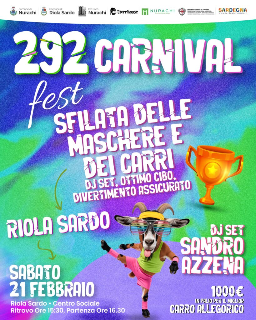 Il 292 Carnival Fest prosegue sabato 21 febbraio a Riola Sardo con una nuova giornata di festa e partecipazione, interamente dedicata alla sfilata di carri allegorici e maschere per le vie del paese.