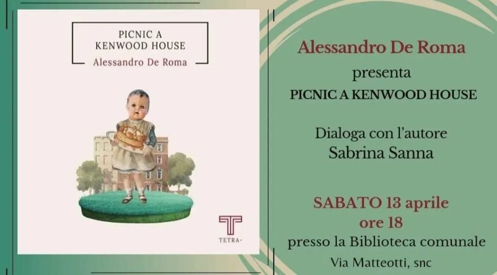 Sarà Alessandro De Roma, col suo ultimo romanzo breve “Picnic a Kenwood House” (Tetra edizioni) il protagonista del prossimo incontro con autore promosso dalla Biblioteca comunale.