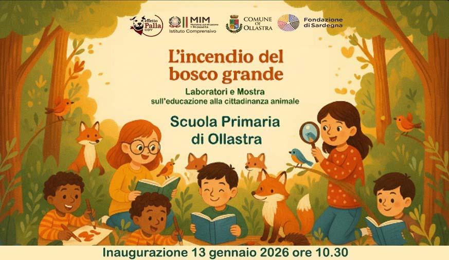 Sarà inaugurata martedì 13 gennaio 2026, alle 10:30, alla Scuola primaria di Ollastra, la mostra conclusiva e la presentazione dei lavori laboratoriali legati al progetto educativo ispirato al libro “L’incendio nel bosco grande”, di Monica Pais. Un percorso che ha visto lavorare insieme Effetto Palla ODV, la Fondazione di Sardegna, il Comune di Ollastra e il mondo della scuola, con l’obiettivo di educare le nuove generazioni alla cittadinanza animale, al rispetto dell’ambiente e alla responsabilità collettiva.