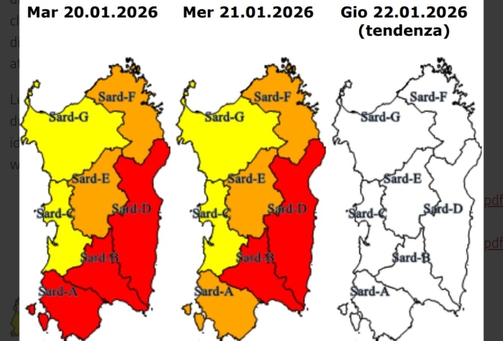codice ROSSO (criticità ELEVATA) per RISCHIO IDROGEOLOGICO, codice ARANCIO (criticità MODERATA) per RISCHIO IDRAULICO sull’area di allerta Iglesiente;