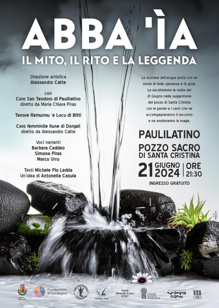Venerdì 21 giugno, a Paulilatino, lo spettacolo Abba ‘ìa, dà il via ad una iniziativa ben più ampia che prende il titolo di Monumentos. A cura del Coro Polifonico San Teodoro di Paulilatino e di Antonella Casula, con la direzione artistica di Alessandro Catte e i testi di Michele Pio Ledda. Abba ‘ìa, l’acqua che vive, scorre e che, piena di vigore, alimenta l’umanità e l’ambiente, originando miti e leggende millenarie.