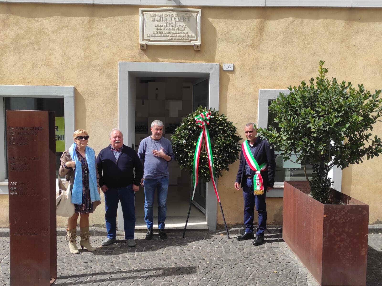 La deposizione della corona di fiori davanti alla casa natale di Gramsci il 27 aprile scorso