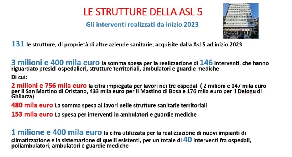 I NUMERI. “Grazie al lavoro puntuale e costante del nostro ufficio tecnico, da inizio 2023 abbiamo predisposto un piano di intervento per la sistemazione di strutture sanitarie, sulle quali, purtroppo, prima non potevamo intervenire direttamente, perché non di nostra proprietà, ma in capo ad Ats dal 2017 e poi ad ARES Sardegna” – spiega Serusi. Il piano di interventi si è concretizzato nella programmazione e spendita di 3 milioni e 400 mila euro. 2 milioni e 756 mila euro è la somma spesa per diversi interventi nell’ospedale San Martino di Oristano. Fra questi 235 mila euro per i lavori edili di sistemazione della Radiologia Territoriale per l’installazione della nuova Tac a 128 strati, 30 mila euro per la ristrutturazione degli spazi destinati ora al nuovo reparto di Urologia, 171 mila euro per i locali destinati a spogliatoio, 118 mila euro per l’adeguamento funzionale del sesto piano del P.O. San Martino destinati ai reparti di Neurologia e Otorinolaringioatria. E poi 433 mila euro nell’ospedale di Bosa, 176 mila per il presidio ospedaliero di Ghilarza.