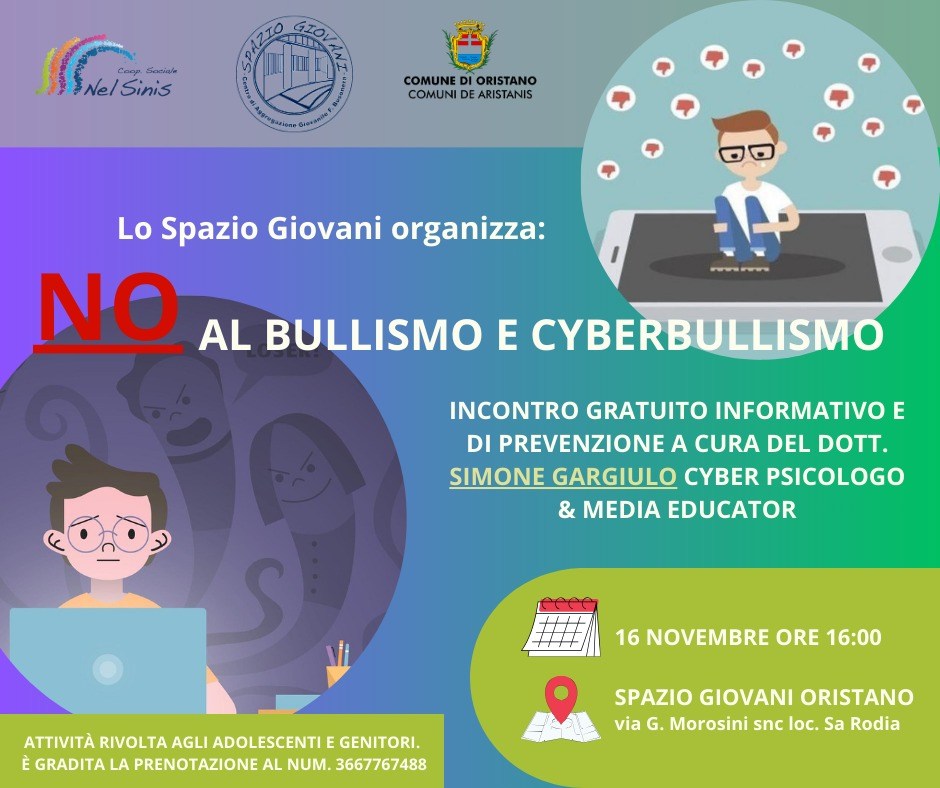 Lo Spazio Giovani in collaborazione con l’Assessorato alle politiche giovanili del Comune di Oristano organizza un incontro dedicato all’informazione su bullismo e cyberbullismo.