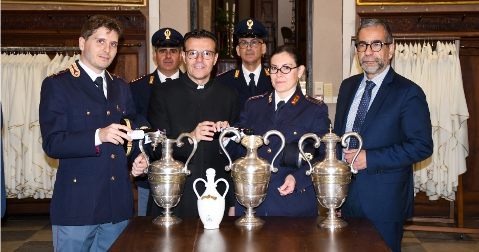 La Polizia di Stato ha consegnato a Monsignor Alessandro Floris, presso la Cattedrale di Oristano, l’Olio Santo di Capaci, destinato ad essere utilizzato in occasione della prossima Messa Crismale del Giovedì Santo, durante la quale verrà consacrato come Sacro Crisma.