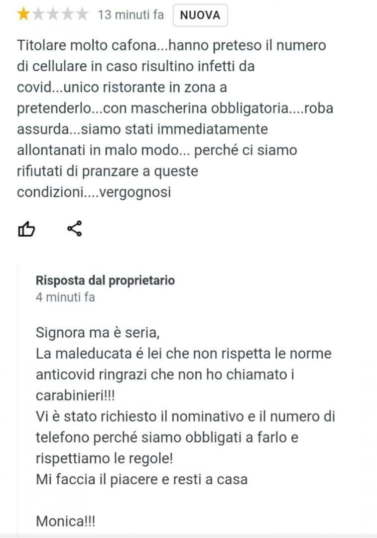 Passa mezz’ora e la coppia di turisti lascia una pessima recensione su una nota piattaforma internet. Monica risponde, ma il rammarico è tanto: “La stessa signora scrive che siamo gli unici a pretendere il rispetto delle regole. Questo ci dispiace molto, sopratutto con quello che stiamo attraversando e considerato che ancora non è finita. Anzi, se siamo ancora così è proprio perché siamo in pochi a far rispettare le regole”.