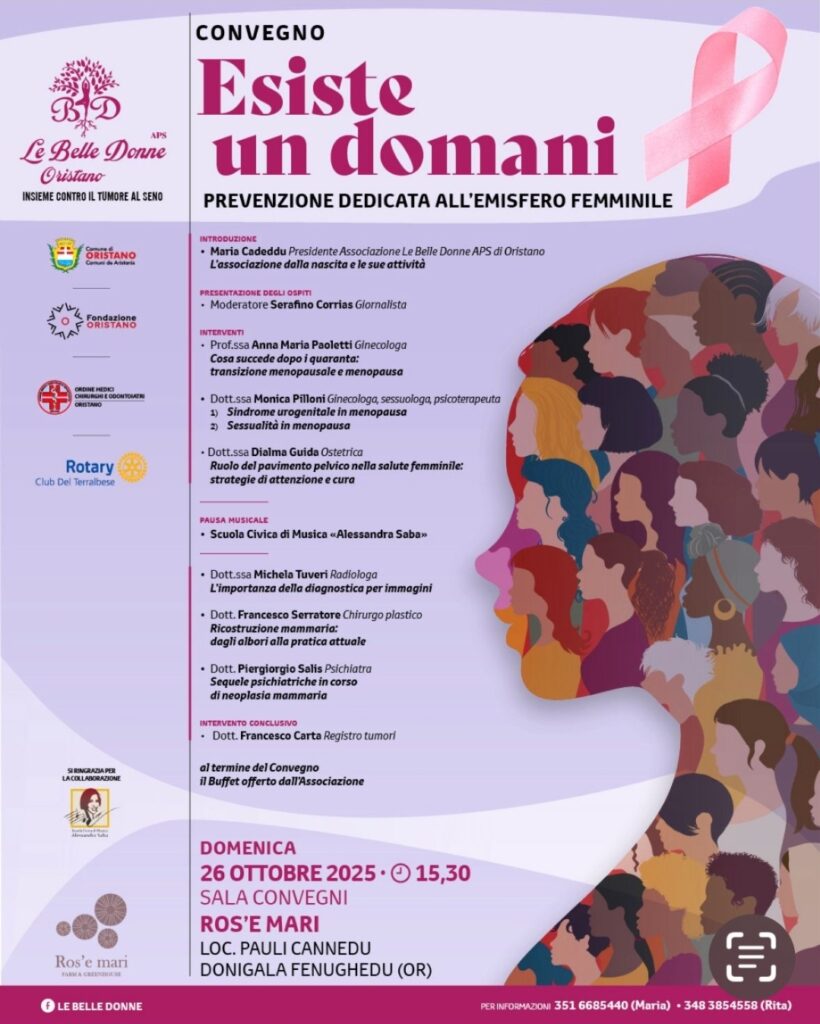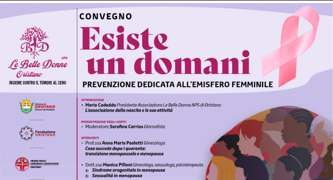 Un incontro pensato per informare, sensibilizzare e sostenere le donne nel percorso di prevenzione e consapevolezza della propria salute. È questo l’obiettivo del convegno “Esiste un domani”, in programma domenica 26 ottobre alle ore 15.30 presso la sala convegni Ros’e Mari di Oristano, organizzato dall’associazione Le Belle Donne APS.