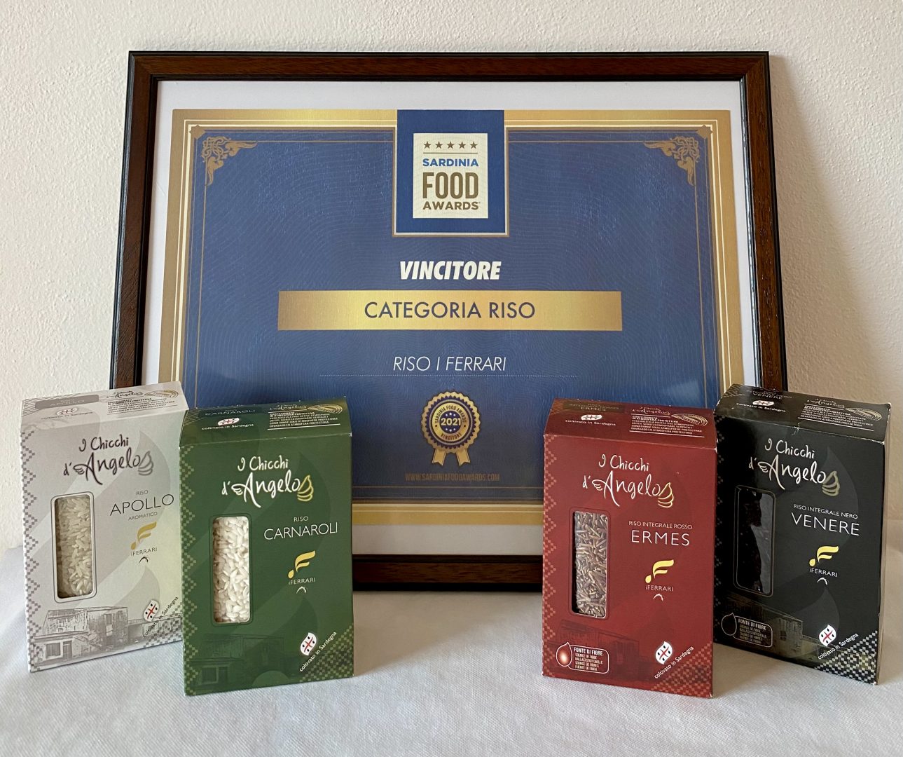 Questo riconoscimento certifica l’alta qualità della linea da tavola “I Chicchi d’Angelo” di “Riso iFerrari” e va ad aggiungersi agli Attestati di Qualità e di Eccellenza ricevuti nel mese di febbraio per la categoria “Produzione riso da seme certificato” che l’Ente Nazionale Risi (Ente di promozione e tutela del settore) ha voluto riconoscere all’azienda risicola oristanese per l’alta qualità della produzione di riso da seme. Dunque una produzione premiata e certificata, a partire dal riso da seme fino al prodotto che giunge nelle nostre tavole: il tutto con una filiera tracciabile al 100%.