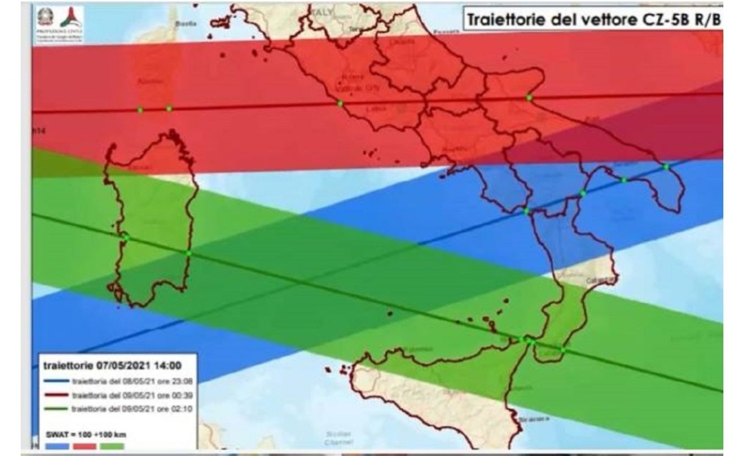Sulla base dell’ultimo comunicato dell’Agenzia Spaziale Italiana, emesso alle ore 21 :01 del 7 maggio 2021, la previsione di rientro sulla terra del vettore PRC CZ-5B R/B è al momento stimata per le ore 02:24 ore locali del 9 maggio, con una finestra temporale di incertezza di ± 6 ore. In questo arco temporale, sono tre le traiettorie di caduta dei frammenti che potrebbero coinvolgere l’Italia, all’interno della fascia di dispersione che interessa porzioni di nove regioni del centro-sud, compresa la Sardegna.