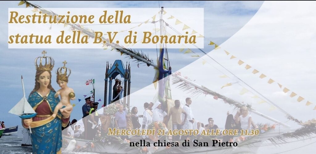 Mercoledì 21 agosto, a Terralba, la statua della Madonna di Bonaria, trafugata lo scorso 19 gennaio, sarà restituita ai cittadini terralbesi dai Carabinieri. La statua, di circa 60 centimetri di altezza, fu realizzata dall’artista Dina Pala e donata alla comunità da una famiglia di devoti. Sarà restituita durante una Santa Messa, presso la Chiesa di San Pietro Apostolo, che si terrà alle 11.30.