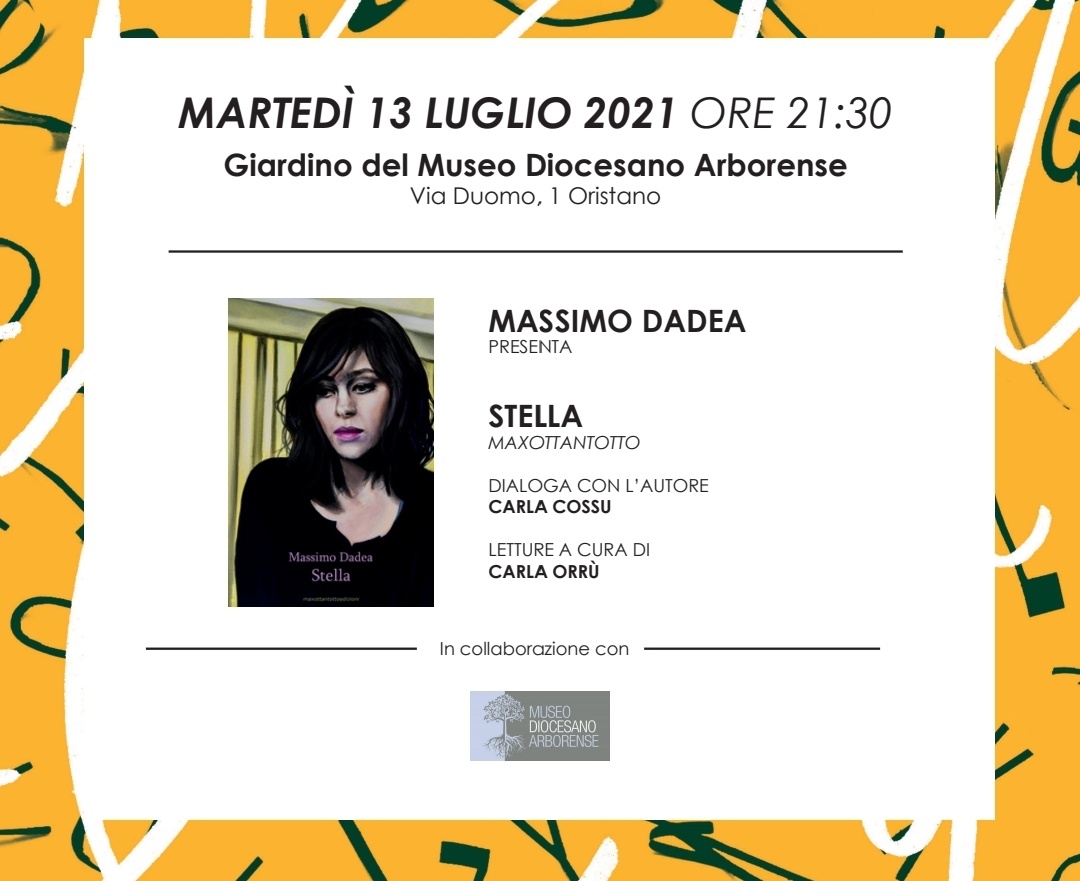• Martedì 13 luglio, alle 30, nel giardino del Museo Diocesano ArborenseMassimo Dadea presenterà “Stella”, il suo ultimo romanzo uscito nelle librerie a ottobre 2020 per Maxottantotto EditoreCarla Cossu accompagnerà l’autore nella presentazione del libro e Carla Orrù ne leggerà alcuni passi.