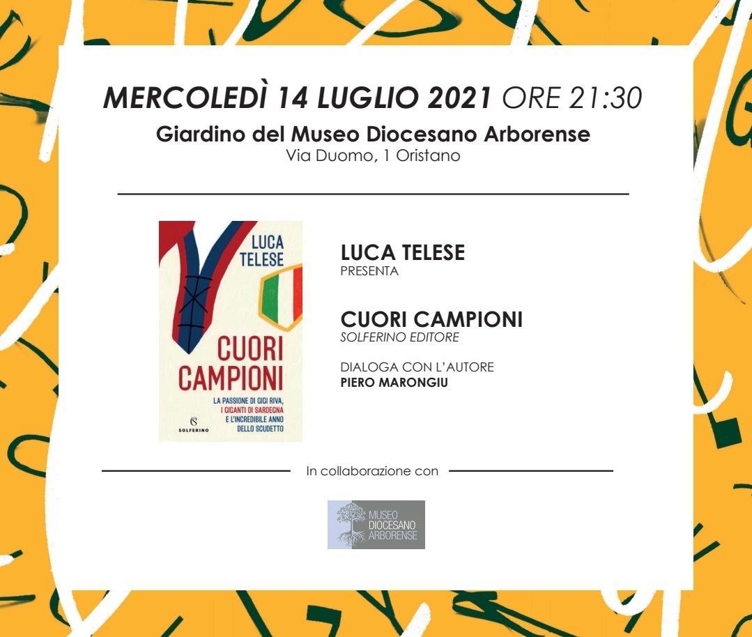 • Mercoledì 14 luglio, alle30, nel giardino del Museo Diocesano Arborense, Luca Telese presenterà “Cuori Campioni”, pubblicato da Solferino editore ad aprile 2021. Ad accompagnare l’autore durante l’incontro sarà Piero Marongiu.