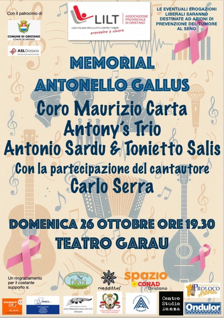 Ad un anno dalla sua scomparsa, la LILT invita tutta la cittadinanza di Oristano e chiunque abbia il piacere di partecipare, al Memorial dedicato al dottor Antonello Gallus, domenica 26 ottobre alle 19.30 presso il Teatro Garau. La serata ha l’obbiettivo di ricordare una persona che ha lasciato un segno profondo nella comunità oristanese.