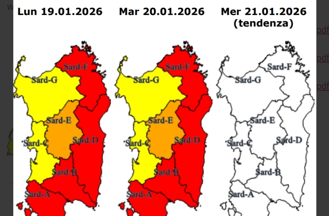 -codice ROSSO (criticità ELEVATA) per RISCHIO IDROGEOLOGICO, codice ARANCIO (criticità MODERATA) per RISCHIO IDRAULICO sulle aree di allerta Flumendosa Flumineddu e Gallura;