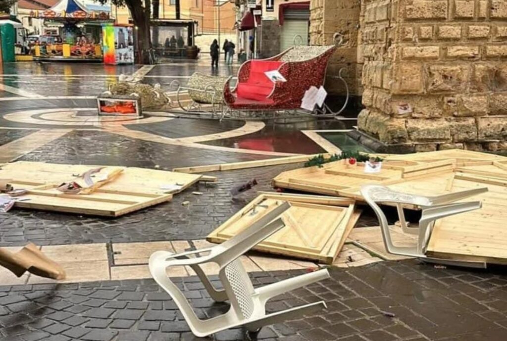 In piazza Cattedrale, i vigili sono intervenuti per la messa in sicurezza dell’albero di Natale, alto decine di metri, che stava dando segnali di cedimento. Per effettuare l’intervento, e per ragioni di sicurezza, è stata chiusa la via Duomo. Forti disagi anche in piazza Roma, dove è crollata una casa di legno e le renne di Babbo Natale