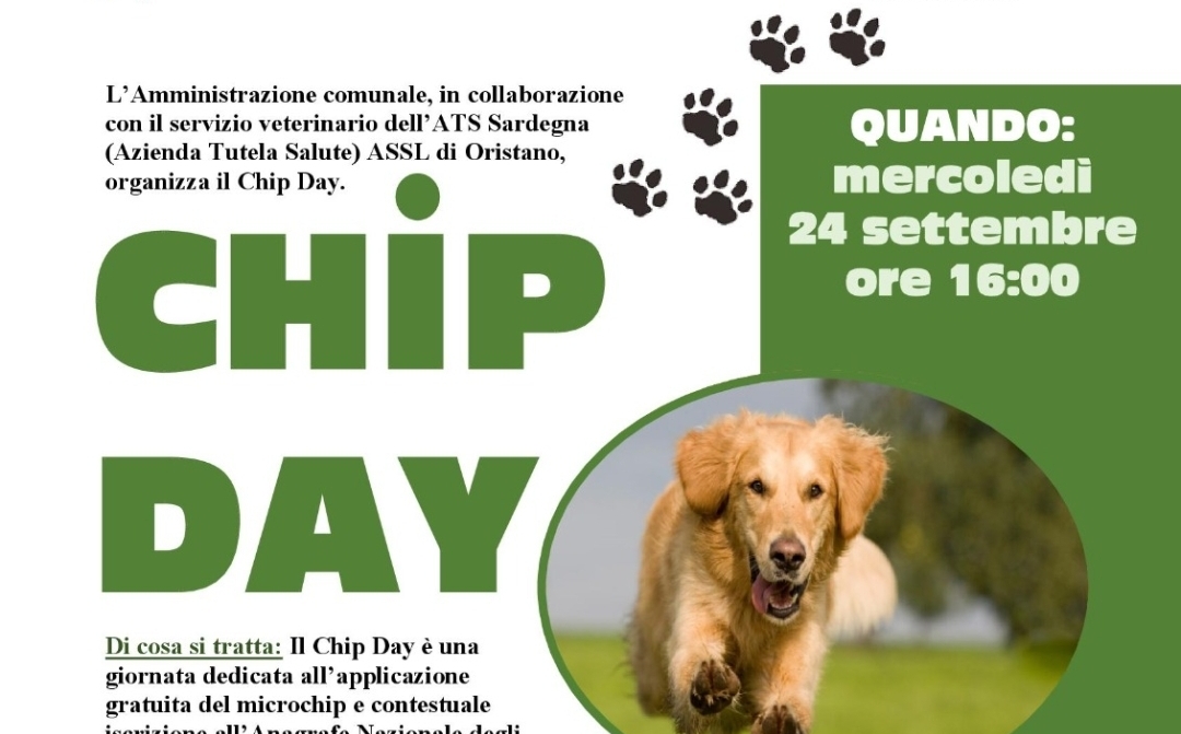 Il Comune di Marrubiu, in collaborazione con l’ATS Sardegna – ASSL di Oristano, organizza il Chip Day: una giornata dedicata all’applicazione gratuita del microchip e alla contestuale iscrizione all’Anagrafe Nazionale degli Animali d’Affezione.