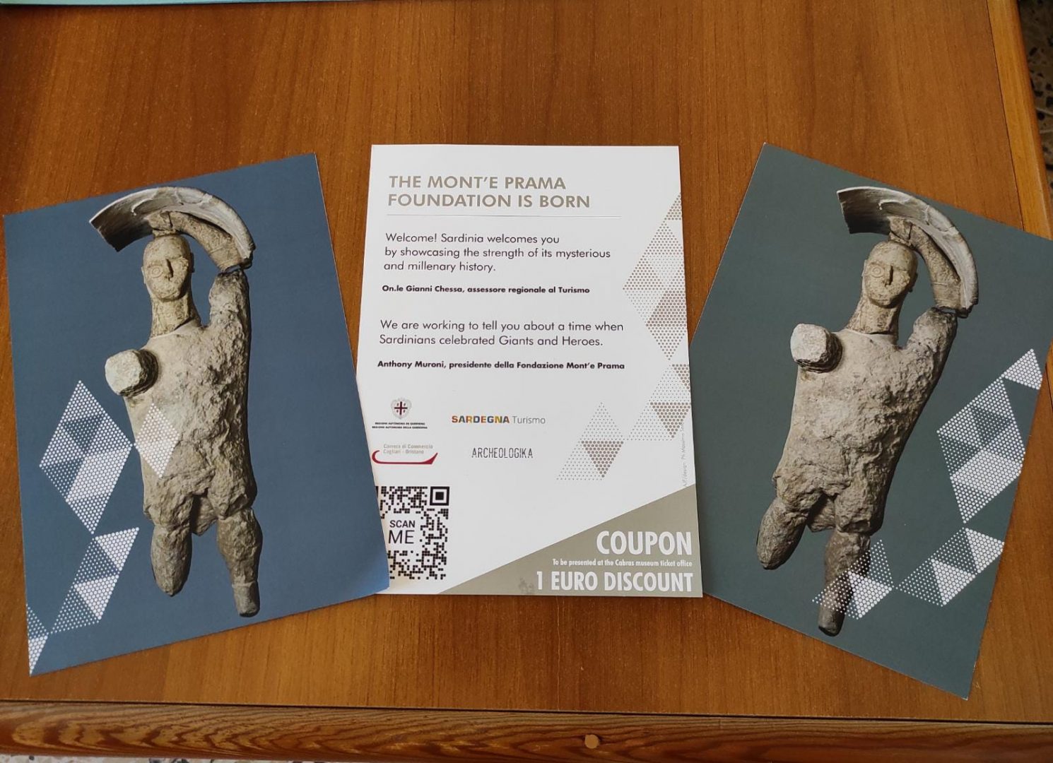 ‘È nata la Fondazione Mont’e Prama’ recita la brochure stampata in 700 mila copie, 350 mila in italiano, le restanti in inglese, tedesco e francese, che riporta poi il benvenuto in Sardegna, ‘terra misteriosa e millenaria’, da parte dell’Assessore regionale alla Cultura Gianni Chessa e del Presidente della Fondazione Mont’e Prama Anthony Muroni.
