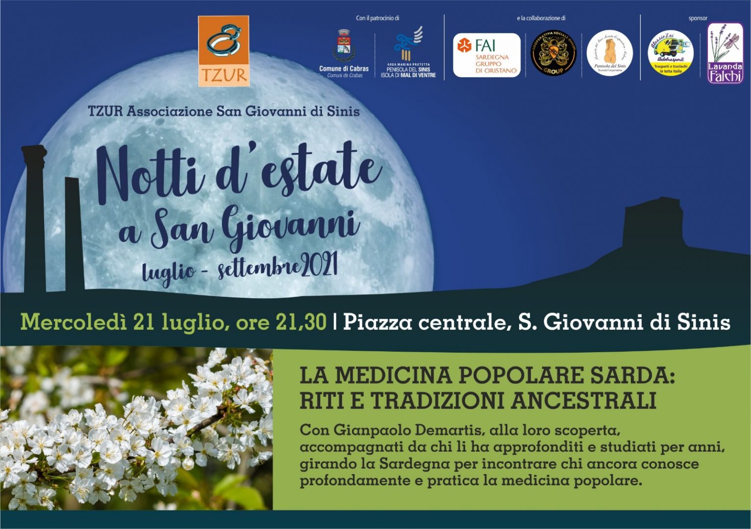 Mercoledì 21 luglio alle ore 21.30 nella piazza centrale (Pratza ‘e sa festa) si svolgerà Il secondo appuntamento della rassegna annuale Notti d’estate a San Giovanni, ideata a organizzata dall’associazione TZUR – San Giovanni di Sinis per l’estate 2021. Una lezione-racconto tenuta da Gianpaolo Demartis, fondatore di Calarighe libera scuola di erboristeria popolare sarda, dal titolo La medicina popolare sarda: riti e tradizioni ancestrali.
