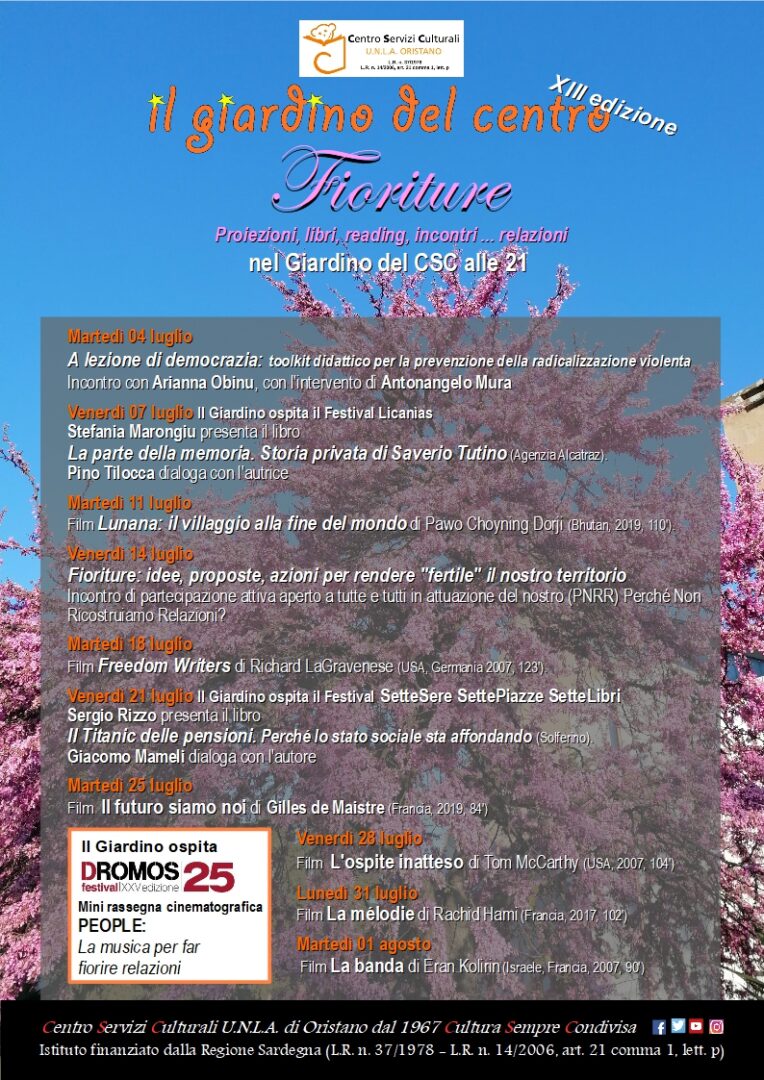La cultura, in quanto esperienza di senso che agisce sulla dimensione cognitiva quanto su quella emotiva, è profondamente connessa allo sviluppo umano, alla fioritura delle persone e delle comunità”. La citazione tratta dall’ultima pubblicazione di Antonella Agnoli “La casa di tutti” (maggio 2023), riassume perfettamente gli obiettivi che il Centro Servizi Culturali UNLA di Oristano vuole raggiungere con le sue attività. Nella programmazione annuale la fase più impegnativa, ma che concentra maggiormente lo sforzo della mission del CSC, è la manifestazione Il Giardino del Centro, giunta quest’anno alla tredicesima edizione e che avrà il tema FIORITURE.