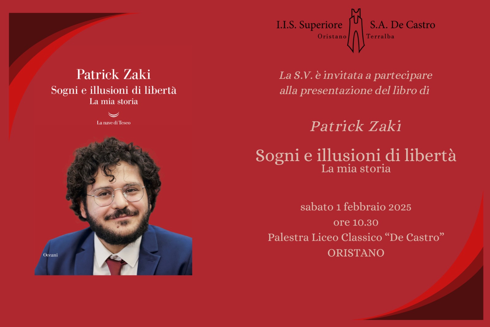 Oristano si prepara ad accogliere Patrick Zaki, che sabato 1° febbraio 2025, alle 10:30, presenterà il suo libro “Sogni e illusioni di libertà. La mia storia”. L’evento si terrà presso la palestra del Liceo Classico “De Castro”, grazie all’organizzazione dell’Istituto di Istruzione Superiore S.A. De Castro di Oristano e Terralba.