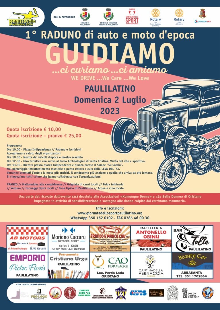 L’Amministrazione comunale di Paulilatino con gli Assessorati alle Politiche Giovanili e Associazionismo e all’Ambiente, rappresentati dagli Assessori Antonella Casula e Mario Putzolu, sostiene l’ASD Tennis Tavolo 2014 Paulilatino che, avvalendosi del prezioso patrocinio dei Club Rotary di Oristano e Centro Sardegna (Ghilarza), dell’Associazione Donatori Nati della Polizia di Stato, con il suo presidente Daniele Rocchi, e la generosa sponsorizzazione di numerosi esercizi ed attività commerciali organizza per Domenica 2 luglio 2023, il 1 Raduno di Auto e Moto d’epoca Guidiamo, ci curiamo, amiamo. We drive, we care, …we Love.