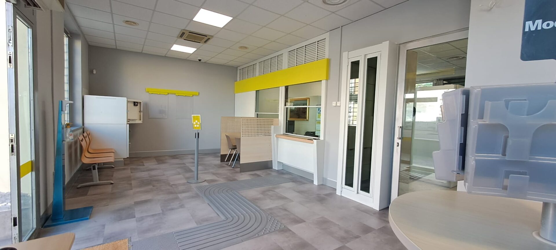 Nell’ambito degli interventi, si è proceduto a una completa riorganizzazione degli spazi finalizzata a ottimizzare la fruizione dell’ufficio con particolare attenzione al miglioramento del confort ambientale e alla facilitazione dell’accesso ai servizi. In quest’ottica, tra le altre opere, si inseriscono la nuova configurazione della linea di sportelleria, con altezze ribassate per agevolare tutti i segmenti di clientela e postazione di lavoro ergonomica per favorire una corretta postura, e la posa di un percorso in rilievo sul piano di calpestio per consentire alle persone con deficit visivi la piena autonomia negli spostamenti all’interno della sala al pubblico senza l’ausilio di assistenza.