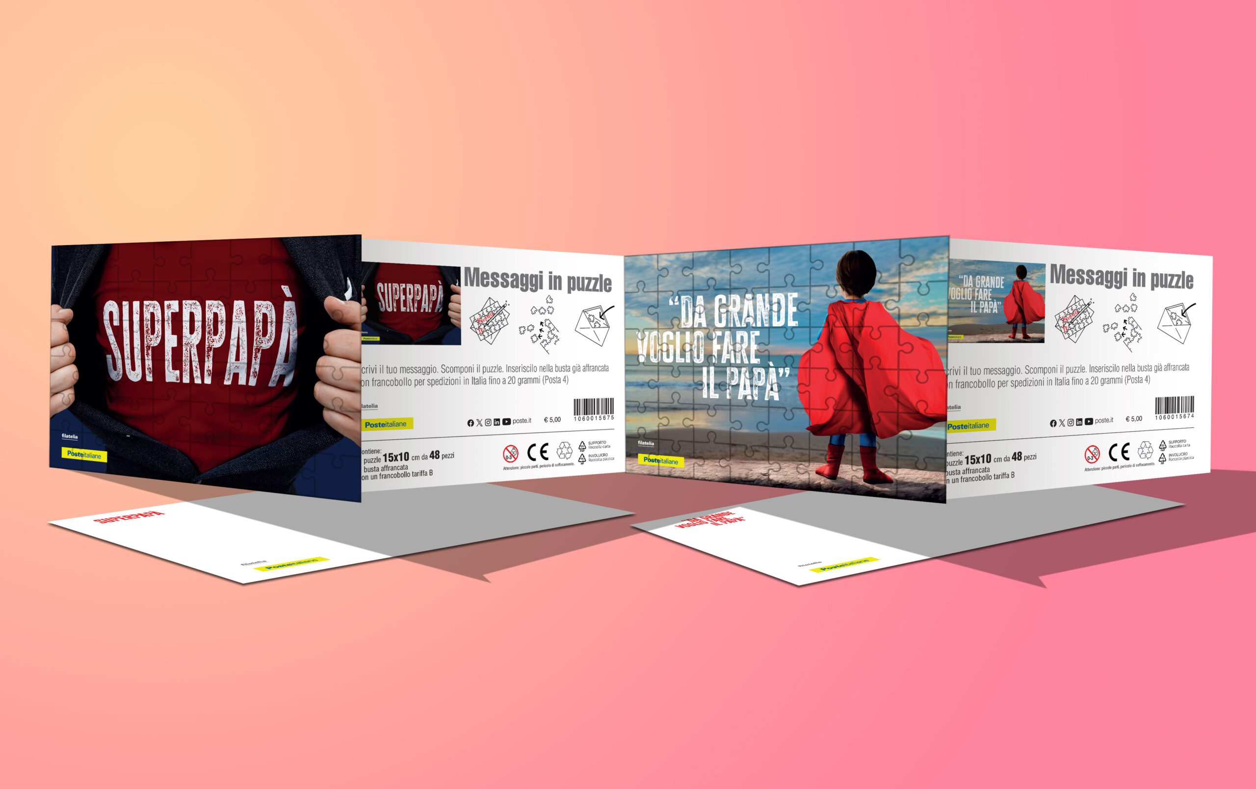 La novità di questo anno sono le due cartoline puzzle “Da grande voglio fare il papà” e “Superpapà” che consentono di scrivere un testo, dividere la cartolina puzzle in singole tessere e spedire il tutto in una busta già affrancata. Il destinatario dovrà ricomporre il puzzle e scoprire il messaggio d’auguri.
