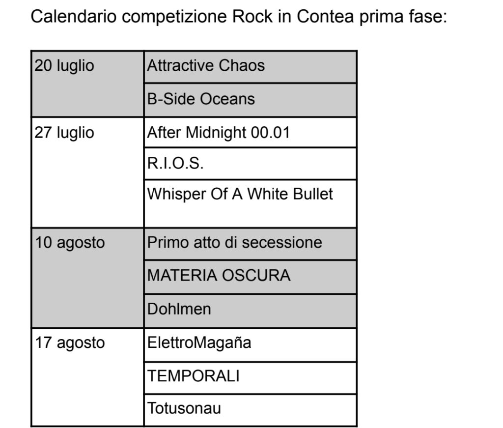 La Contea è pronta a far esplodere le calde notti oristanesi, con una nuove edizione di “Rock in Contea”, fortunato festival musicale che cresce in maniera esponenziale, anno dopo anno. Dopo aver ospitato le fasi finali delle selezioni regionali per Arezzo Wave, l’Associazione Culturale Ricreativa “Contea” annuncia la tredicesima edizione del festival musicale dedicato ai gruppi rock sardi, autori di testi e musiche originali. Rock in Contea 2024, per la fase preliminare di qualificazione alle finali, si snoda nelle serate del 20 e 27 luglio, 10 e 17 agosto. Alla fine di queste quattro serate, i sei gruppi più votati dalla giuria accederanno alle semifinali di settembre, e i primi tre classificati si sfideranno nella finale di ottobre.