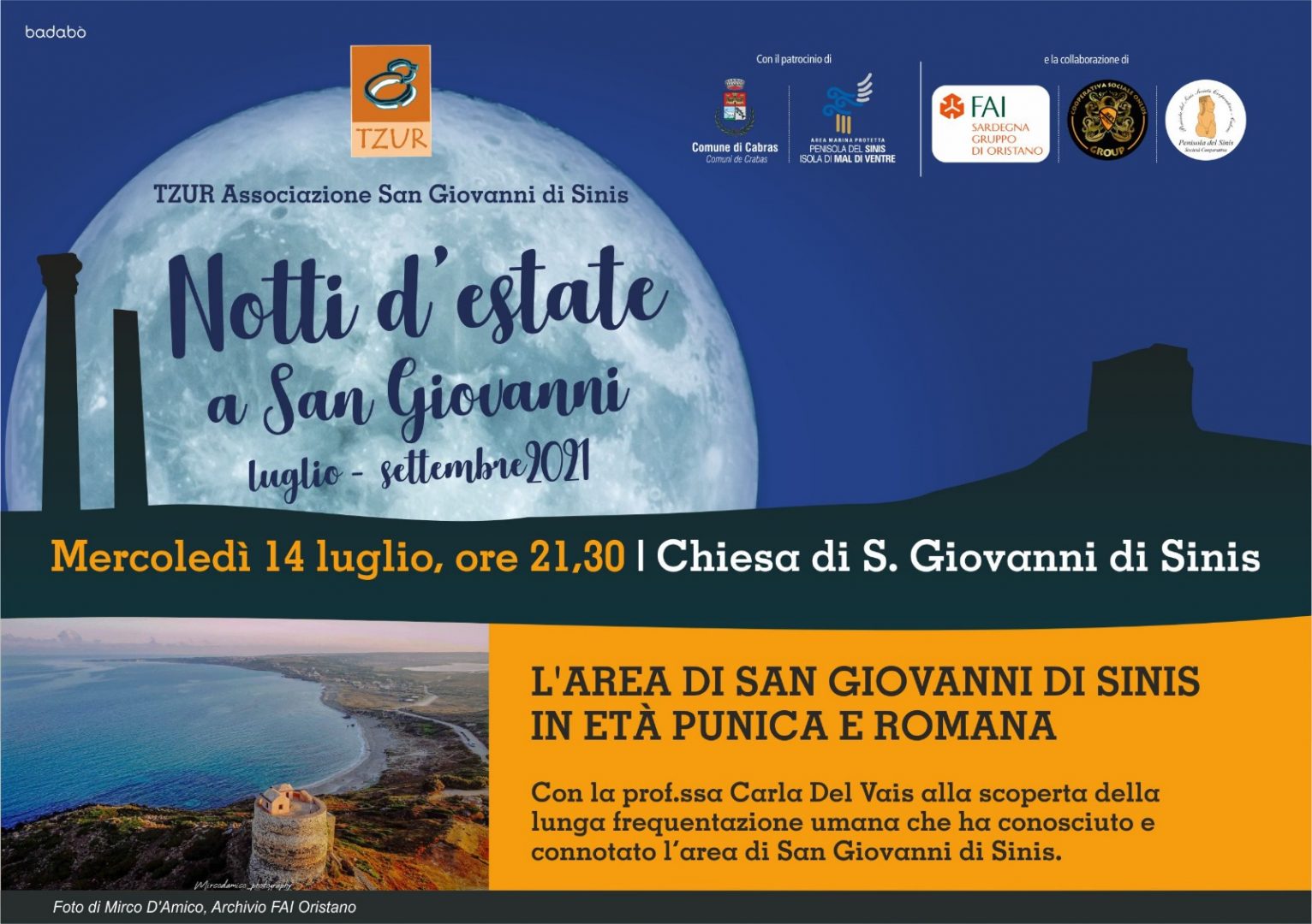 Il primo appuntamento si svolgerà mercoledì 14 luglio alle ore 21.30 presso la incantevole chiesa di San Giovanni di Sinis. La professoressa Carla Del Vais, professore associato di Archeologia fenicio-punica presso il dipartimento di Lettere, Lingue e Beni Culturali dell’Università degli Studi di Cagliari e direttore scientifico del Museo Civico Giovanni Marongiu di Cabras, racconterà L’area di San Giovanni di Sinis in età punica e romana.