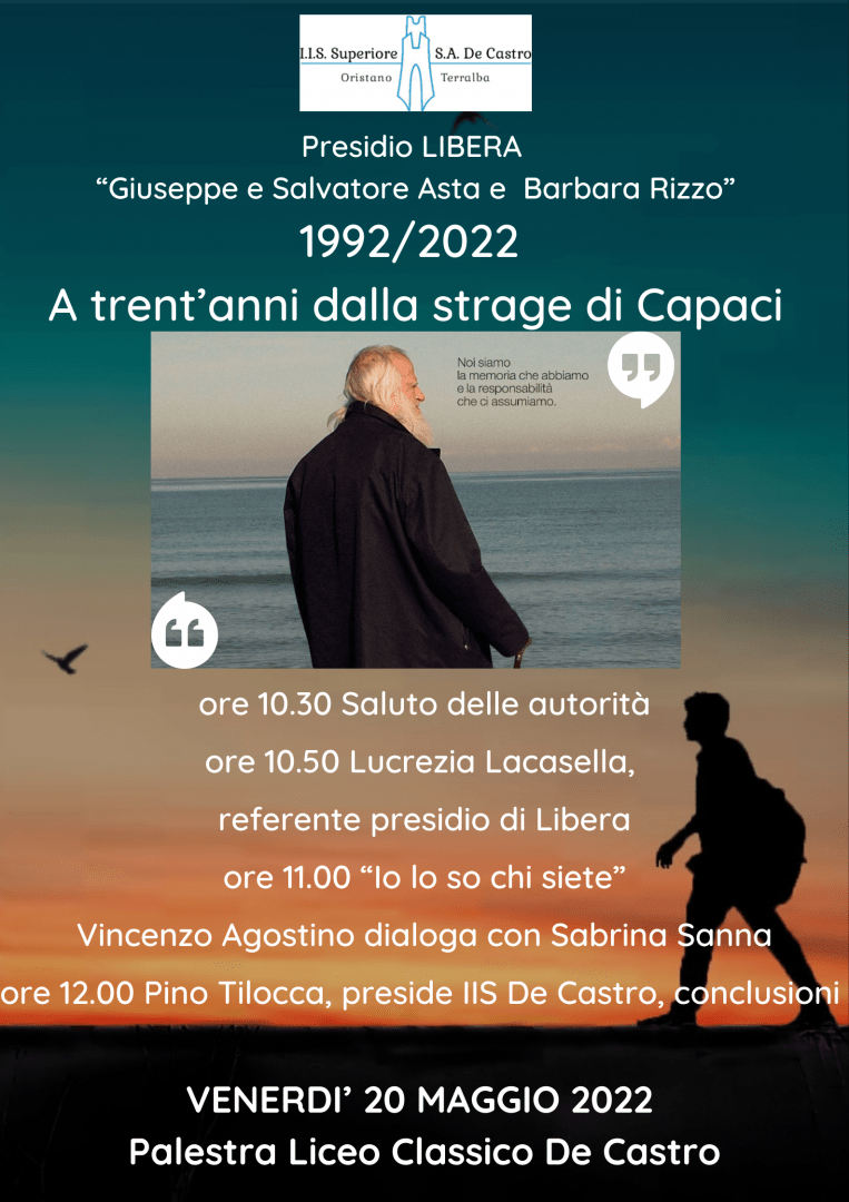 Venerdì 20 maggio il presidio di Libera dell’istituto De Castro commemorerà il trentennale della strage di Capaci, nella quale furono uccisi il giudice Giovanni Falcone, la moglie Francesca Morvillo e gli agenti della scorta Antonio Montinaro, Vito Schifani e Rocco Dicillo.