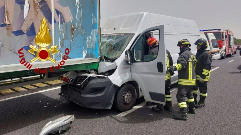 Per cause da accertare, un Fiat Ducato ha tamponato un tir, distruggendo la parte anteriore del mezzo.