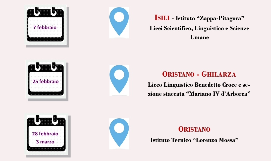Secondo appuntamento il 25 febbraio con due iniziative: una di mattina nel Liceo Linguistico “Benedetto Croce” di Oristano e l’altra nel pomeriggio nella sezione staccata “Mariano IV di Arborea” a Ghilarza. Due iniziative si terranno ancora a Oristano, a partire dalle 8;30, nell’Istituto Tecnico “Lorenzo Mossa” il 28 febbraio e il 3 marzo 2025.